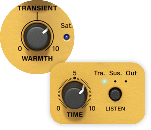 - ‘Time’ knob affects length of transient or tail of sound
