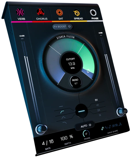 Storch Filter features five built-in FX that you can apply to your filtered signal: reverb, chorus, saturation, a stereo spreader, and a phaser. These five effect modules are tied to the plugin’s cutoff and resonance knobs, so the more you adjust your signal, the more pronounced the selected effect(s). There’s also an FX Boost slider so you can further color your tone for even bolder results.