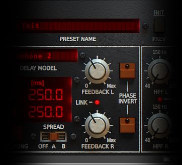 Repeater’s SPREAD option can help you easily create wide stereo delays with the touch of a button. Just choose your delay note or ms value, and then SPREAD can automatically deviate the delay lines by either 10ms or 20ms, as well as automatically panning the delays left and right. SPREAD can help you utilize Repeater’s delay tones to make complex soundscapes.